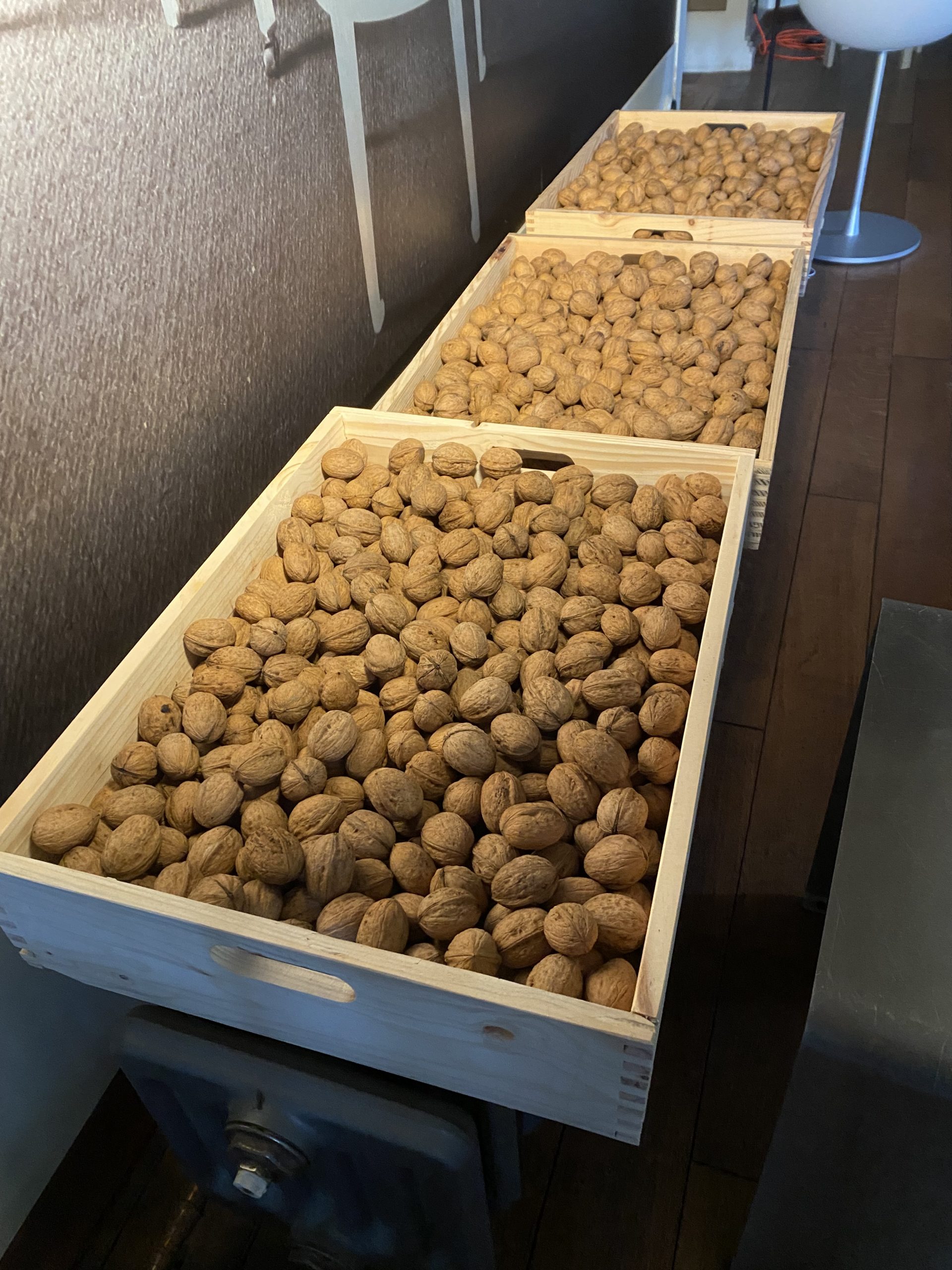 Dieses Jahr satte Ernte überall, nachdem im letzten Jahr alle Blüten und Blätter im April erfroren sind. Dies Jahr fielen die Nüsse schon Ende September, noch vor dem Laub. Und wir haben neue Lagerkisten gebaut, mit Fingerzinken, wie sich‘s gehört.